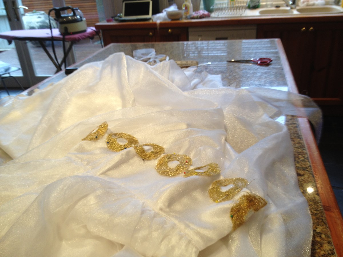 Sarah making her 21st birthday gown. It features machine embroidered lace circles that she is pinned around the top of the bodice.